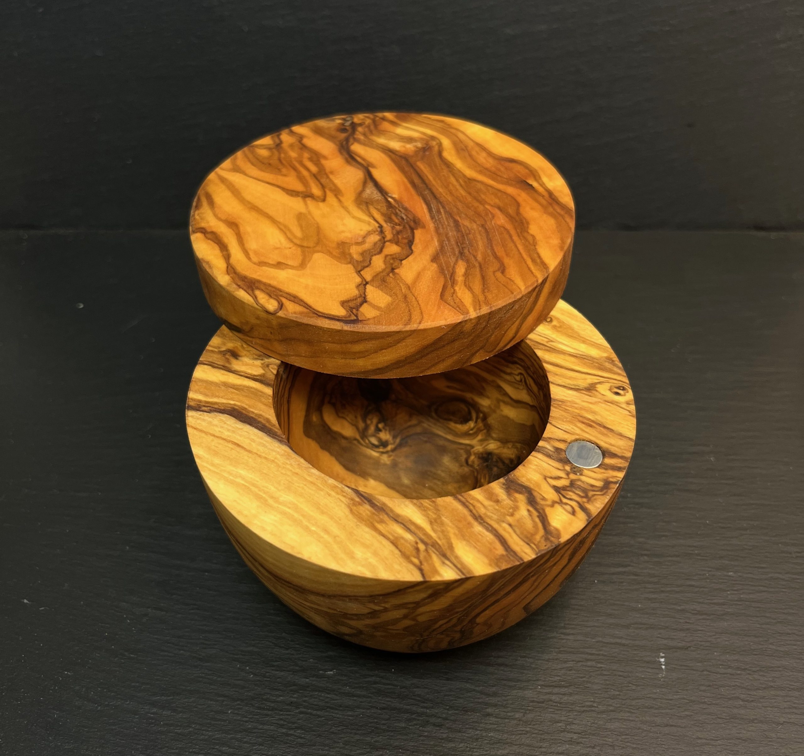 Magnifique main à sel en bois d’olivier avec couvercle pivotant, fermeture par aimant. Fabrication artisanale près d’Antibes.